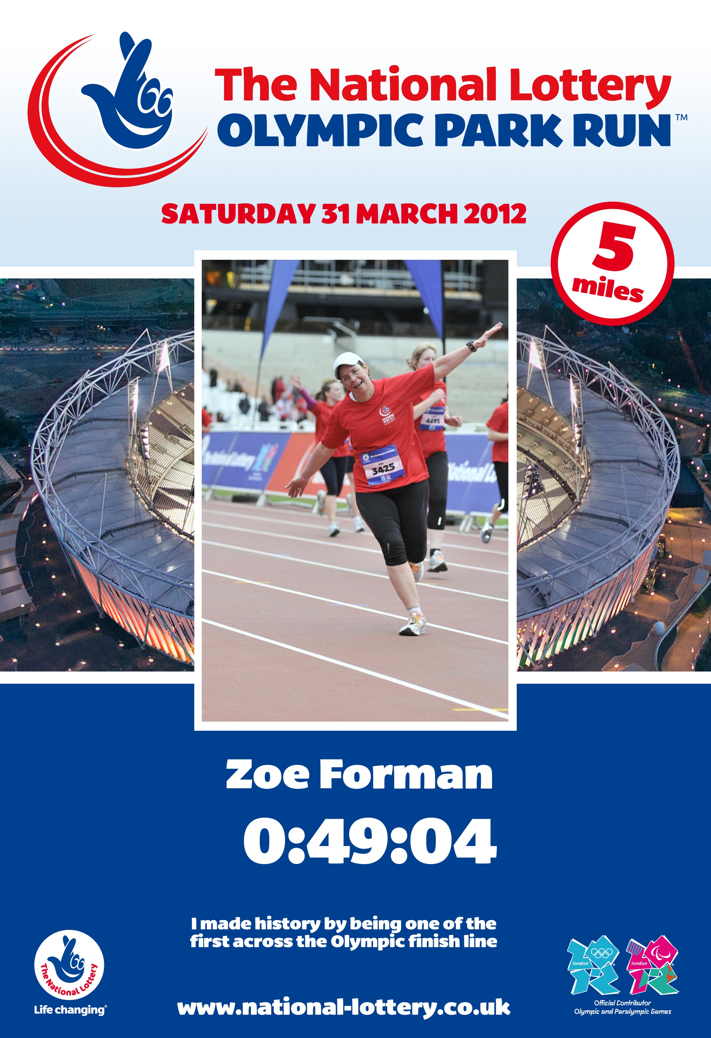 In reverse order for the week the first part of my Olympic dream was being one of 5,000 lucky runners that were able to run 5 miles around the Olympic park and into the stadium and across the finish line on the track.