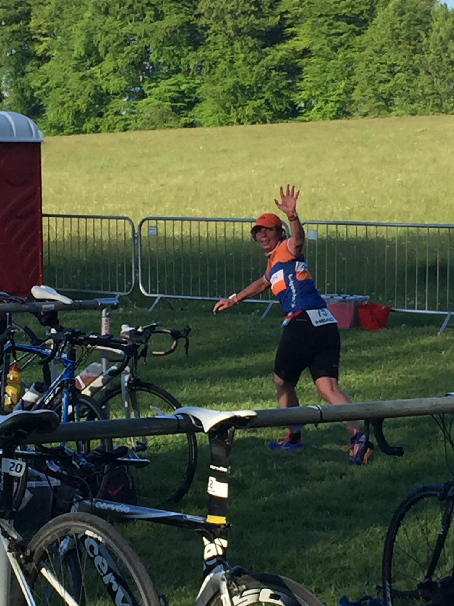 The following morning my feet were covered in bruises and shredded from the lake. The lake grabbers did a great job hauling us into the plastic pontoon where it was a new element -find your shoes then you ran up the grassy bank to the road and continued 600meters to T2.