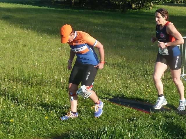 T2 came around just after the hour on the bike I saw family & club supporter and with a wave was off on the 4.5 mile trail run. Only I was floored within 5meters as I was turning my race belt round it fell down to my ankles tripping me up!